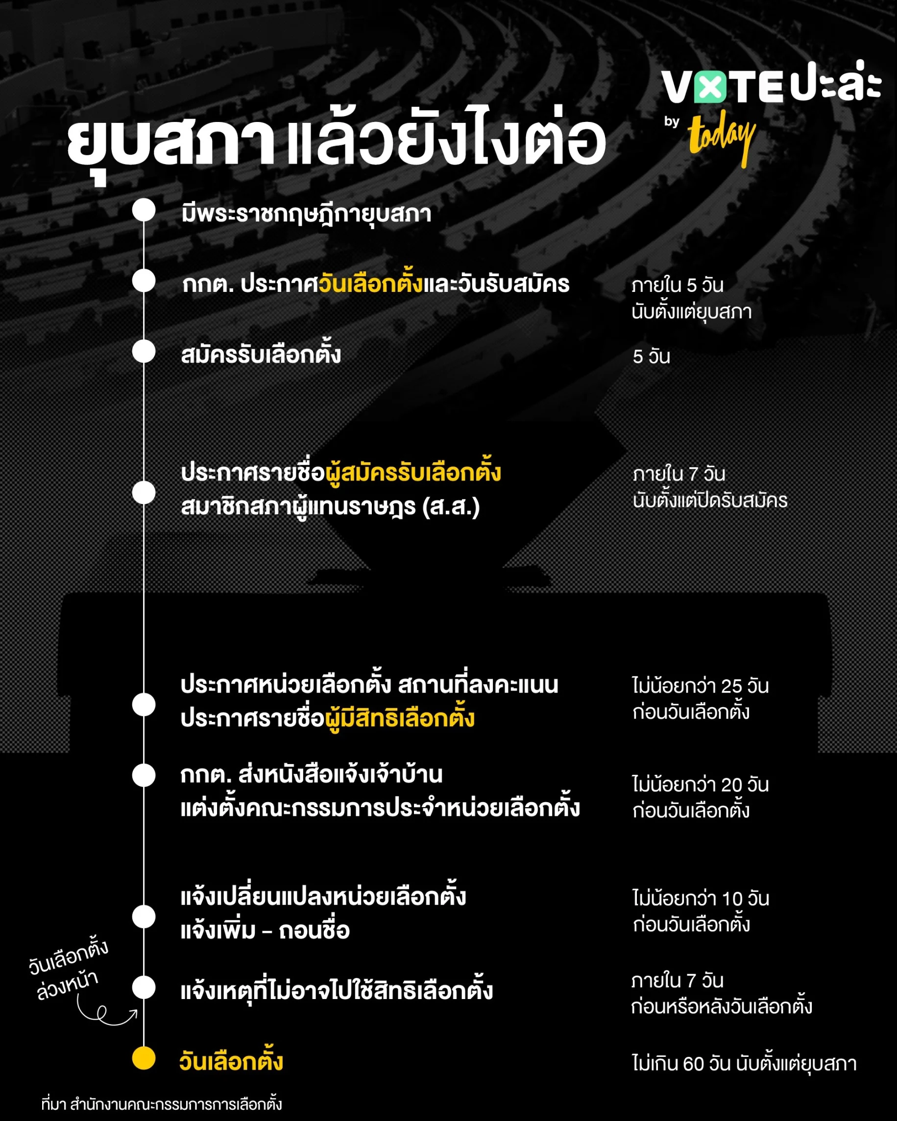 และสุดท้าย ‘วันเลือกตั้ง’ จะเกิดขึ้นภายใน 45-60 วันนับตั้งแต่ยุบสภา ซึ่งคาดว่าจะเป็นวันที่ 7 พ.ค. หรือ 14 พ.ค. 2566 นั่นเอง