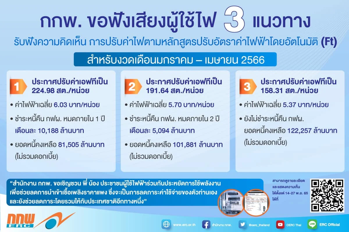 3 ทางเลือกปรับขึ้นค่าเอฟทีงวด ม.ค. – เม.ย. 66 ส่งผลค่าไฟฟ้าอยู่ที่ 5.37-6.03 บาท/หน่วย พร้อมเปิดรับฟังความคิดเห็นตั้งแต่ 14 ถึง 27 พ.ย. 65 ก่อนประกาศใช้จริง