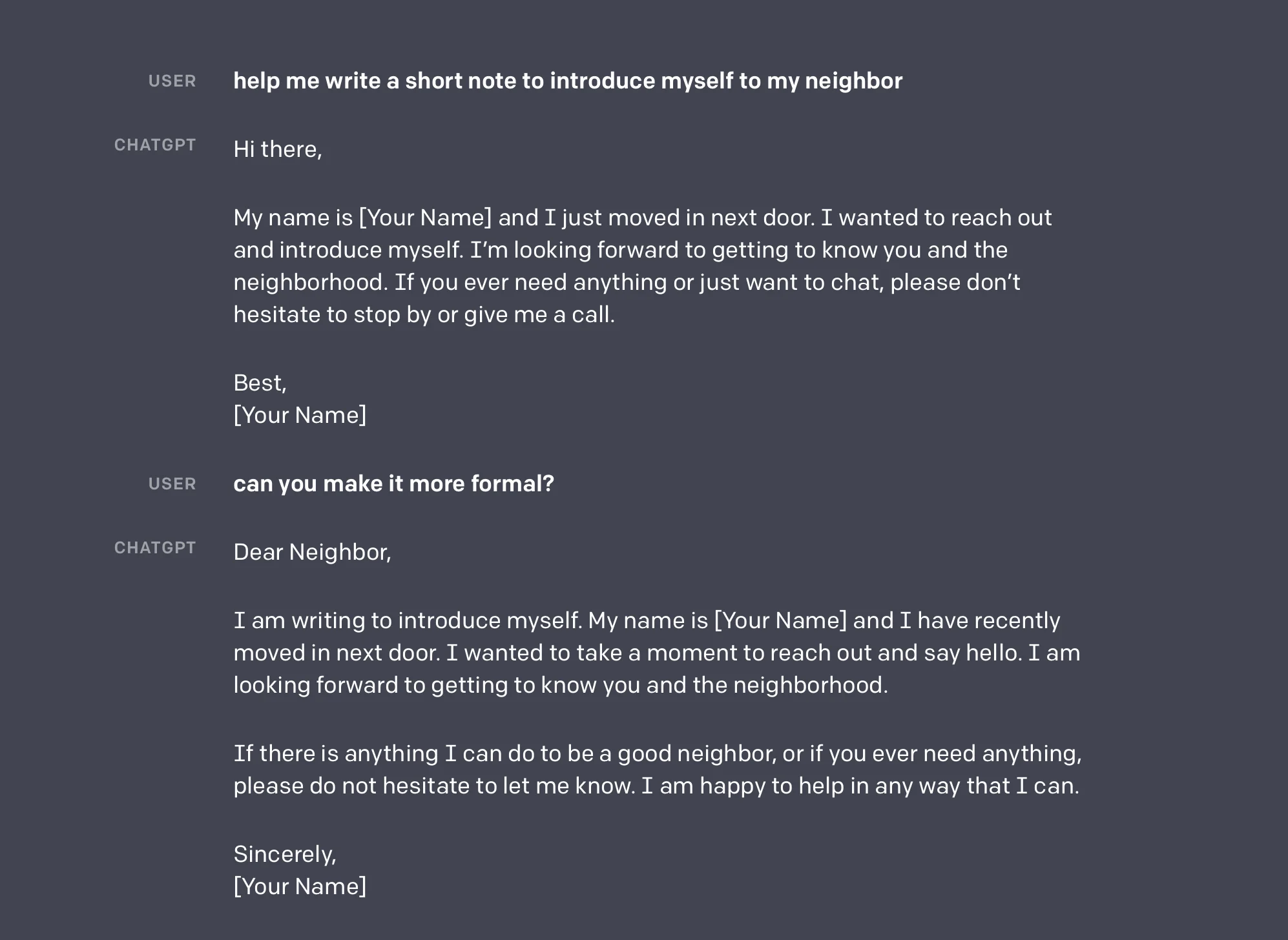 จากตัวอย่างข้างบน USER ขอให้ ChatGPT ช่วยเขียนบันทึกแนะนำตัวเองกับเพื่อนบ้าน และขอให้เขียนสองรูปแบบคือเป็นทางการและไม่เป็นทางการ ผลคือ ChatGPT เขียนมาให้ทั้งสองแบบ และยังรู้ว่าภาษาที่ควรใช้เป็นทางการ คือกลุ่มคำไหนบ้าง