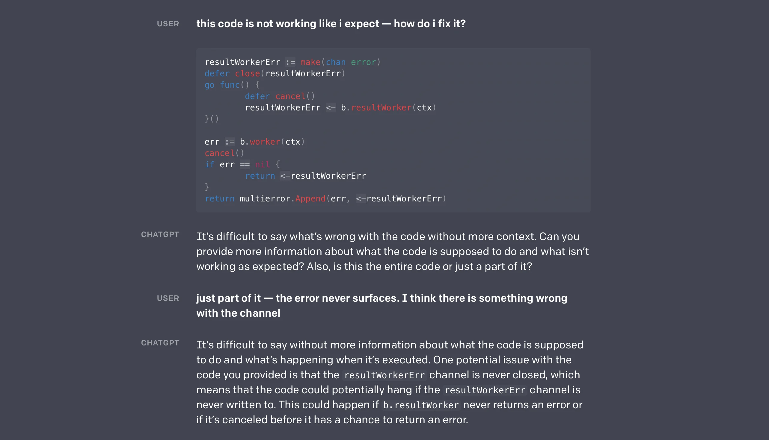 อีกตัวอย่างที่น่าสนใจคือ ช่วยแนะนำการเขียนโปรแกรม โดย USER คนหนึ่งนำโค้ดที่เขียนไปถาม ChatGPT บอกว่าโค้ดพวกนี้ไม่สามารถทำงานได้ ความผิดพลาดเกิดจากตรงไหน สิ่งที่ ChatGPT ทำคือขอข้อมูลเพิ่มเติมจาก USER เพราะ ChatGPT บอกว่าข้อมูลแค่นี้ไม่เพียงพอ ยากแก่การตัดสินใจ จน USER ค่อยๆ ให้ข้อมูลเพิ่มขึ้น และ ChatGPT ก็แนะนำวิธีเขียนโค้ดอีกแบบที่อาจแก้ปัญหาได้