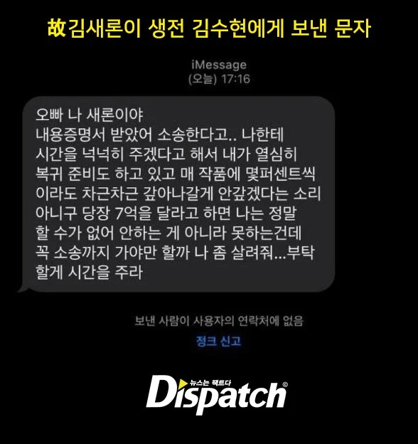 ต่อมา ในช่วง มี.ค. 2024 คิมแซรนได้รับหมายเตือนให้จ่ายเงินจำนวน 700 ล้านวอน หรือ ประมาณ 16.2 ล้านบาท จากนั้น คิมแซรนก็พยายามติดต่อคิมซูฮยอนเรื่องการชำระหนี้ แต่เขาไม่เคยรับโทรศัพท์ ต่อมา คิมแซรนพยายามใช้เบอร์ของญาติติดต่อไป แต่ก็ไม่มีใครรับสาย แต่กลับมีเบอร์นักข่าวโทร.มาที่เบอร์ของญาติ และถามว่านี่เป็นเบอร์ใหม่ของแซรนหรือเปล่า หลังจากนั้น คิมแซรน ได้ส่งข้อความหาคิมซูฮยอนโดยมีเนื้อความว่า