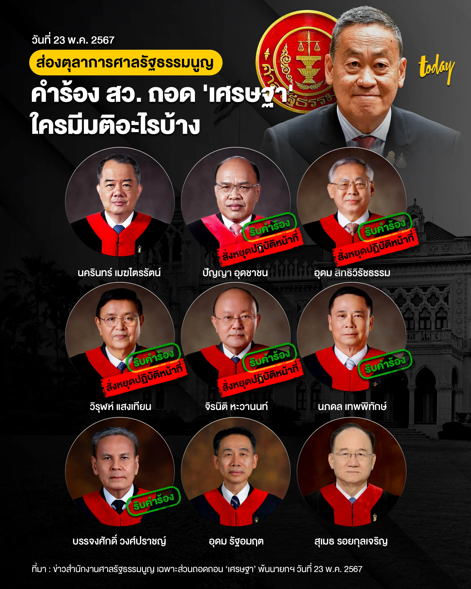 ด่วน! ศาลรัฐธรรมนูญ เสียงข้างมาก รับคำร้อง ’40 สว.’ เฉพาะส่วนของ ‘เศรษฐา’ และมีมติ 5 ต่อ 4 ไม่สั่ง ‘เศรษฐา’ หยุดปฏิบัติหน้าที่ ‘นายกรัฐมนตรี’
