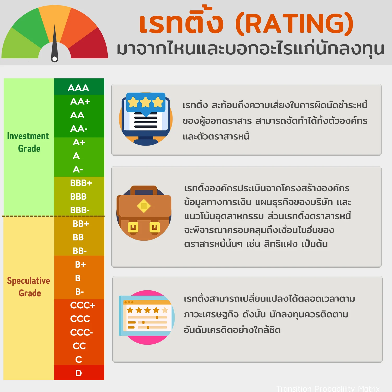1) กลุ่มที่น่าลงทุน (Investment Grade) หมายถึง เรทติ้งตั้งแต่ระดับ AAA ลงมาถึง BBB-