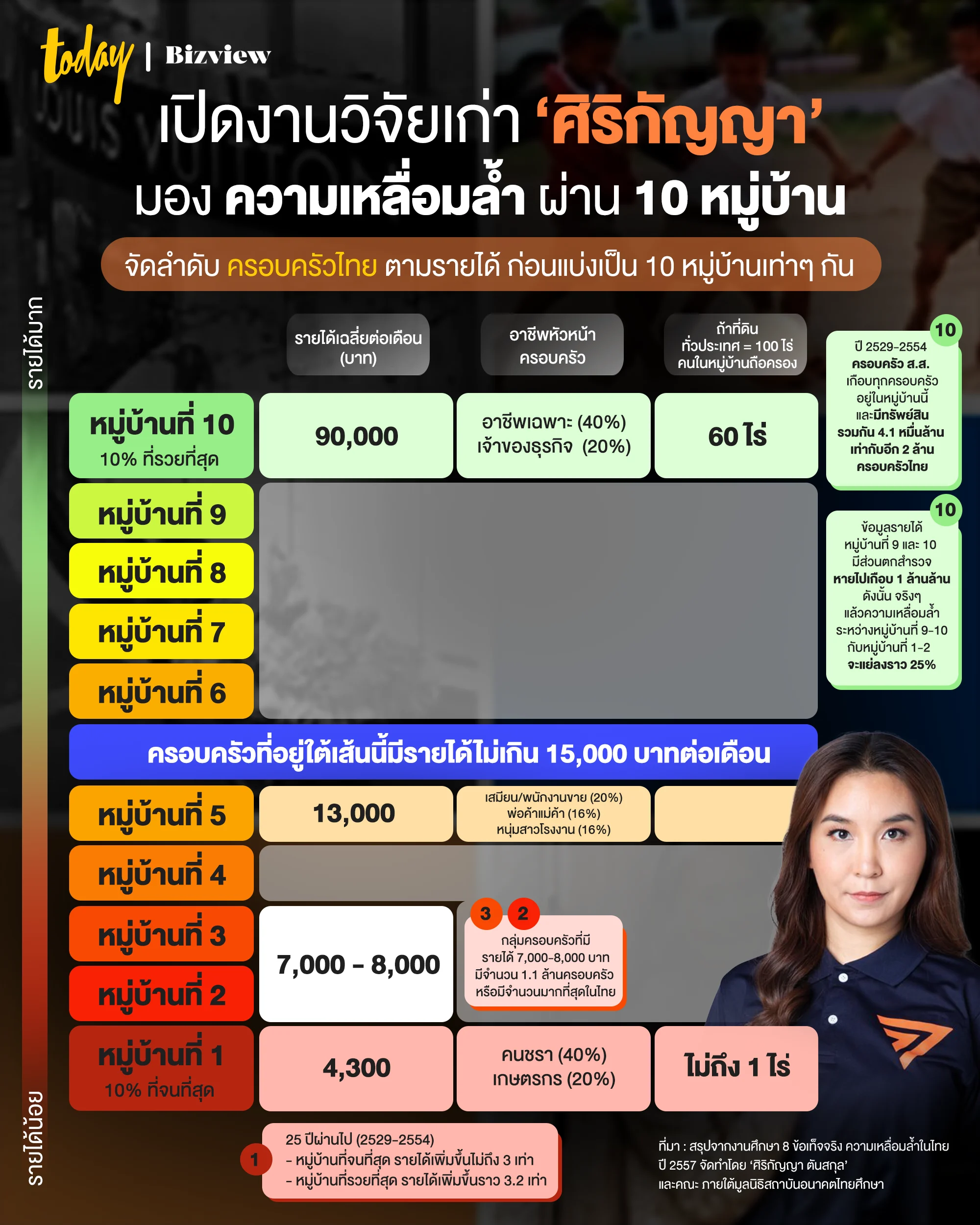 – โดยครอบครัวที่มีรายได้ 7,000-8,000 บาท คือ กลุ่มที่มีจำนวนมากที่สุดในประเทศไทย มีจำนวน 1 ล้านครอบครัวอยู่ในหมู่บ้าน 2-3