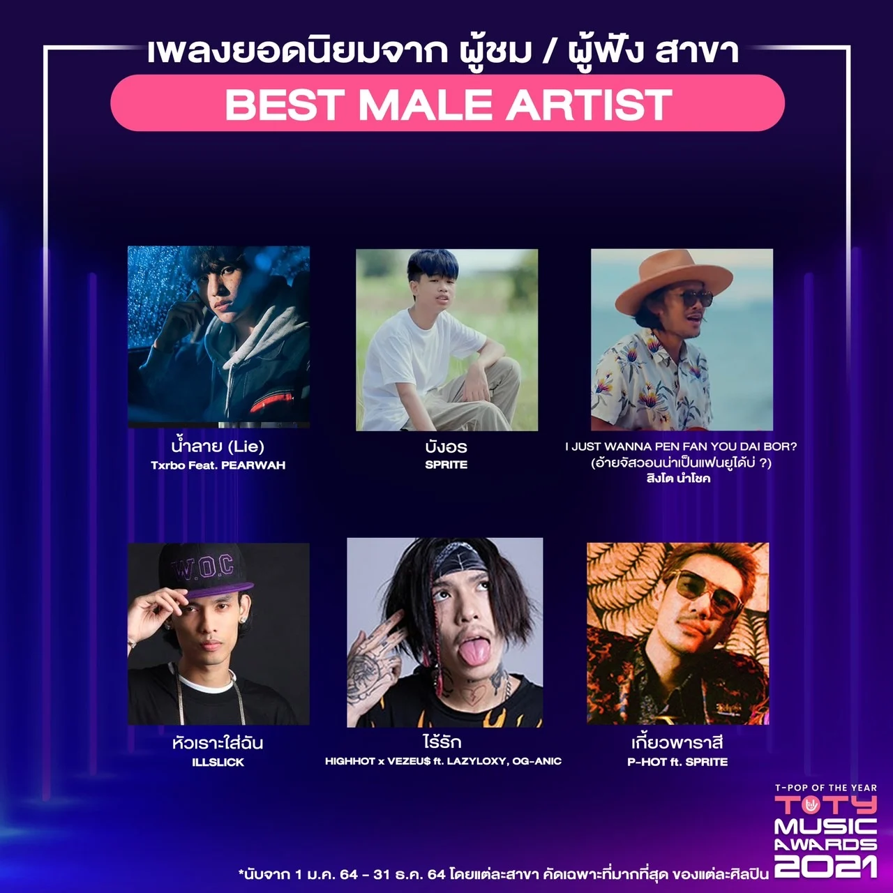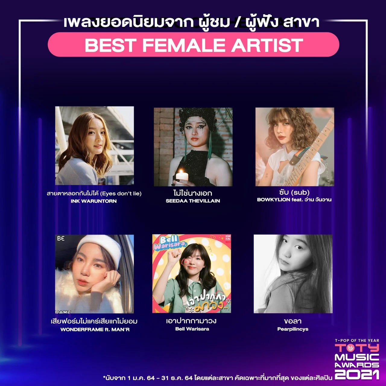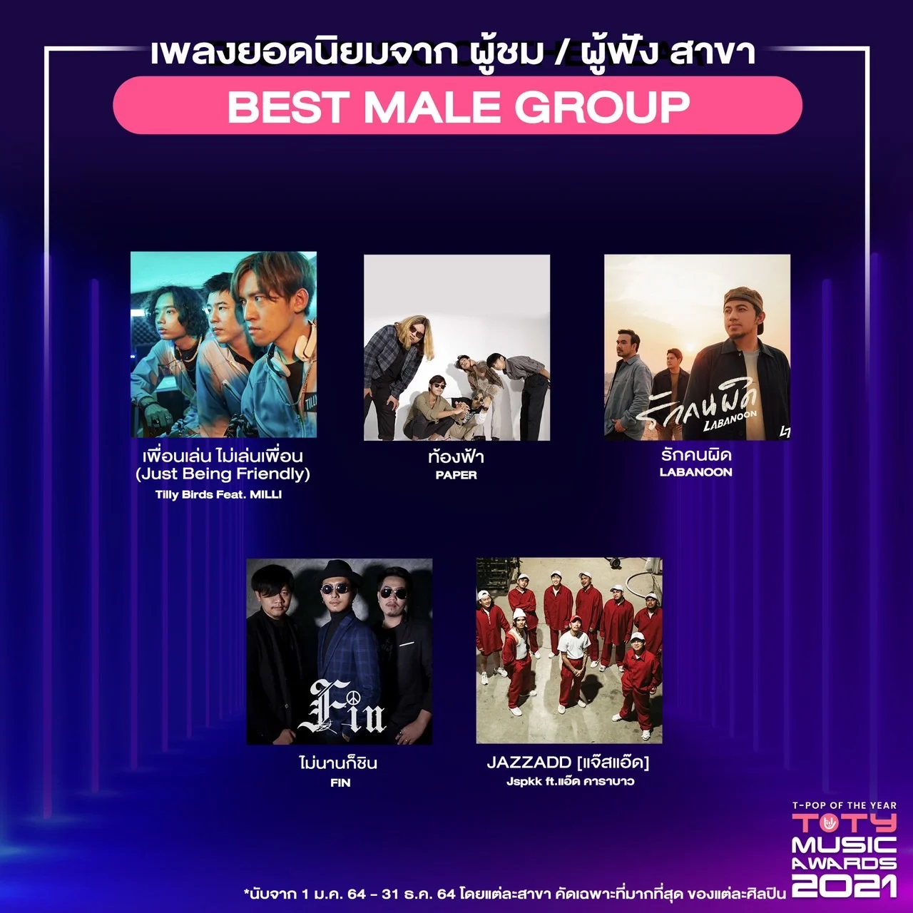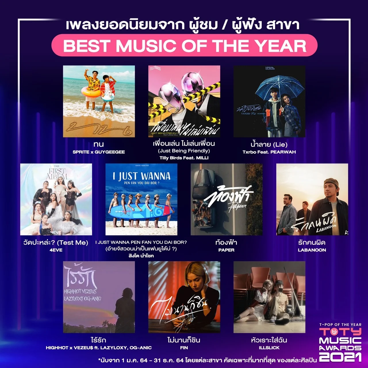 เปิดเผยผู้เสนอชื่อเข้าชิงเป็นที่เรียบร้อย สำหรับงานประกาศรางวัล ‘TOTY AWARDS 2021’ ที่มอบให้กับผู้ผลักดันวงการ T-POP ให้ขับเคลื่อนในอุตสาหกรรมเพลงไทย โดยแฟน ๆ สามารถโหวตให้กับเพลง หรือ ศิลปินที่ชื่นชอบ รวมถึงการชมและฟังเพลงจากมิวสิคสตรีมมิ่ง (ในระหว่างวันที่ 1-21 ก.พ. 65) ก็จะถูกนับคะแนนด้วย