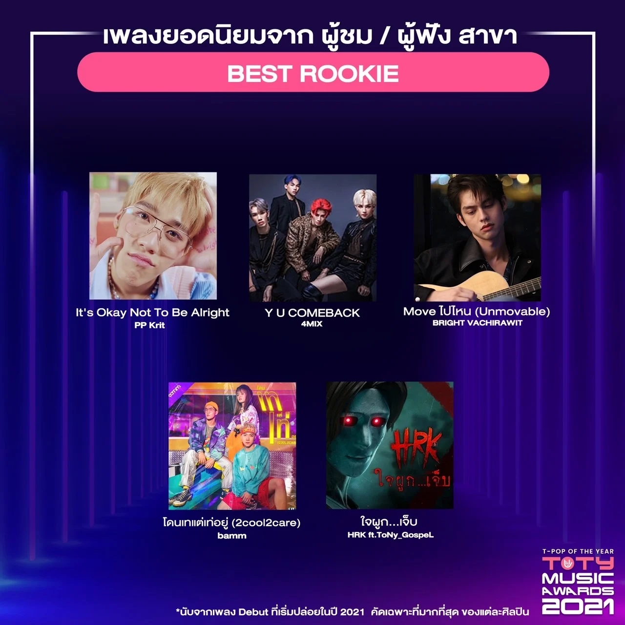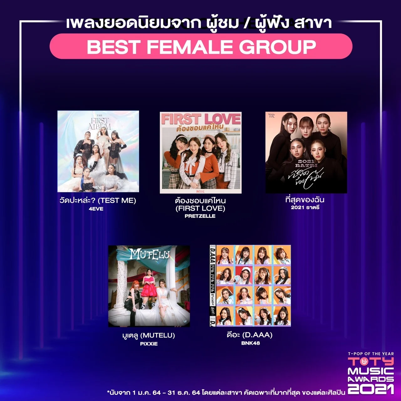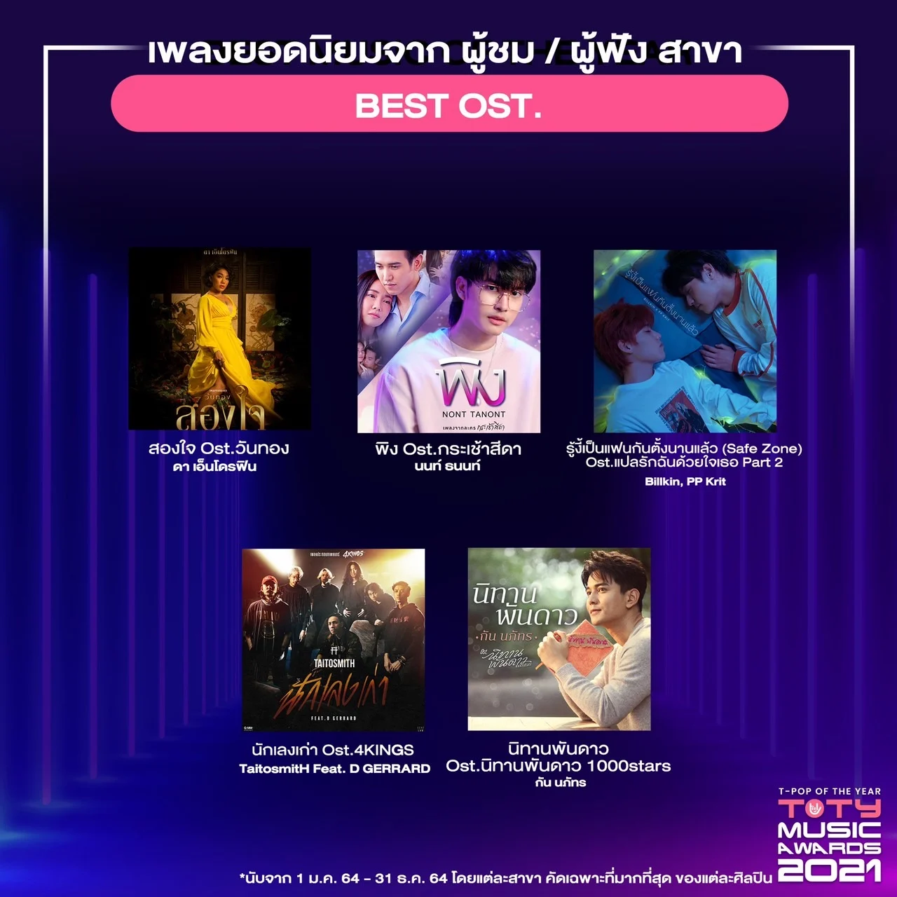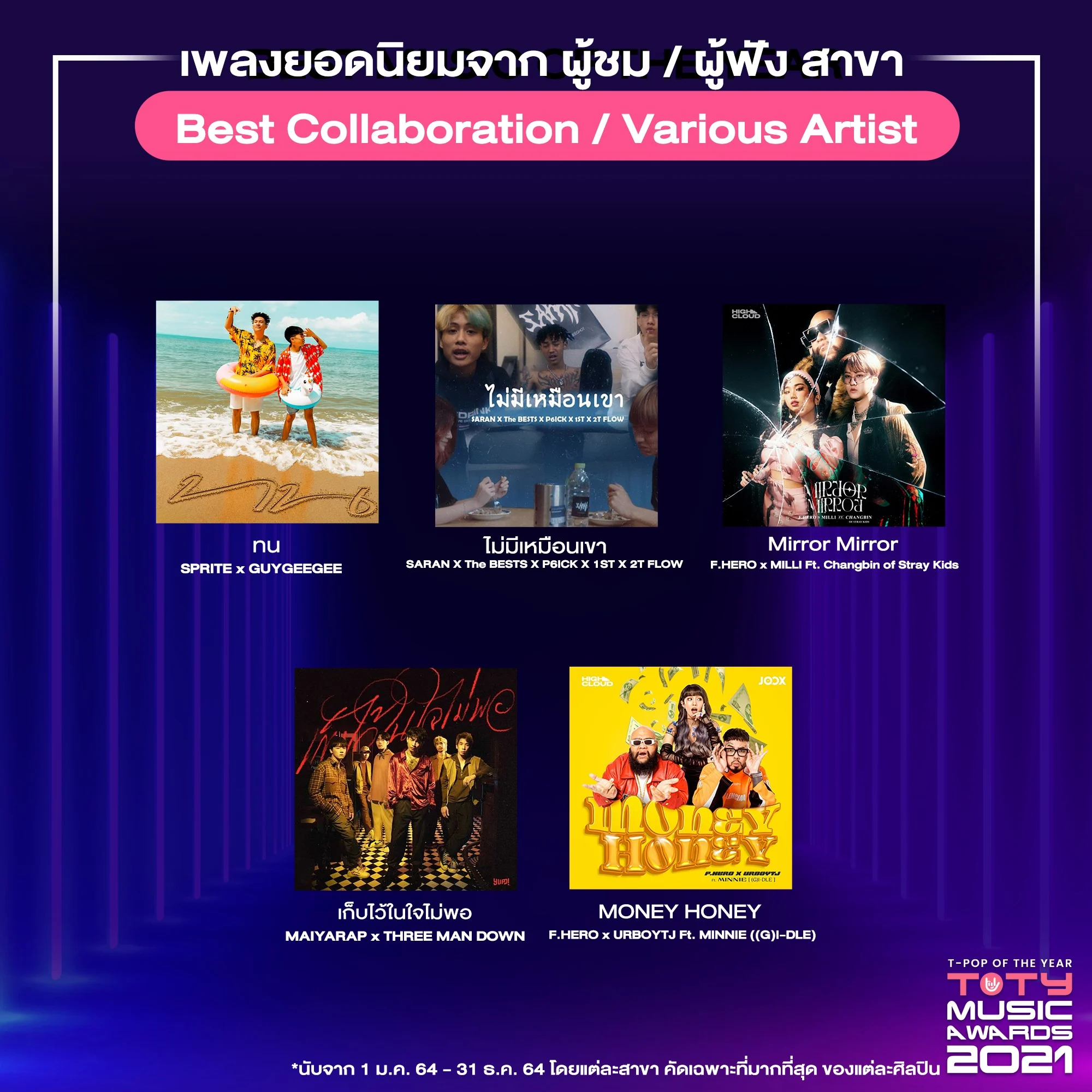 รางวัลนี้ตัดสินโดยคะแนนจาก Data from Streaming Platform สำหรับเกณฑ์การนับคะแนนของ ‘TOTY AWARDS 2021’ นับจาก คะแนน VOTE ผ่านแอปพลิเคชัน T-POP 40% (1-21 ก.พ. 65), คะแนนจาก YouTube 35% (ที่เพิ่มขึ้นในช่วง 1-21 ก.พ. 65) และจาก Spotify 25% (ที่เพิ่มขึ้นในช่วง 1-21 ก.พ. 65) ซึ่งเพลงทุกเพลงที่ได้รับรางวัลเพลงยอดเยี่ยม เก็บข้อมูลจากปี 2564 (1 ม.ค. 2564 – 31 ธ.ค. 2564 และนับเฉพาะที่ปล่อยภายใน 1 ม.ค. – 31 ธ.ค. 64) ทั้งนี้ ทุกเพลงยังคงมียอด Streaming เพิ่มขึ้นอย่างต่อเนื่องสม่ำเสมอ