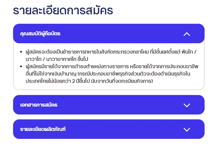 หนึ่งในนั้นคือ บัตรเครดิตที่ชื่อว่า ‘บัตรเครดิต ทีทีบี รอยัล ท็อป บราส’ โดยบัตรเครดิตใบนี้มีคำอธิบายว่า นี่คือบัตรเครดิตแห่งเกียรติยศที่สะท้อนภาพลักษณ์แห่งความเป็นผู้นำของข้าราชการทหารชั้นผู้ใหญ่ ใช้จ่ายง่าย สะสมคะแนนได้เร็วกว่า แบ่งจ่าย 0% ไม่ต้องรอโปรโมชั่น
