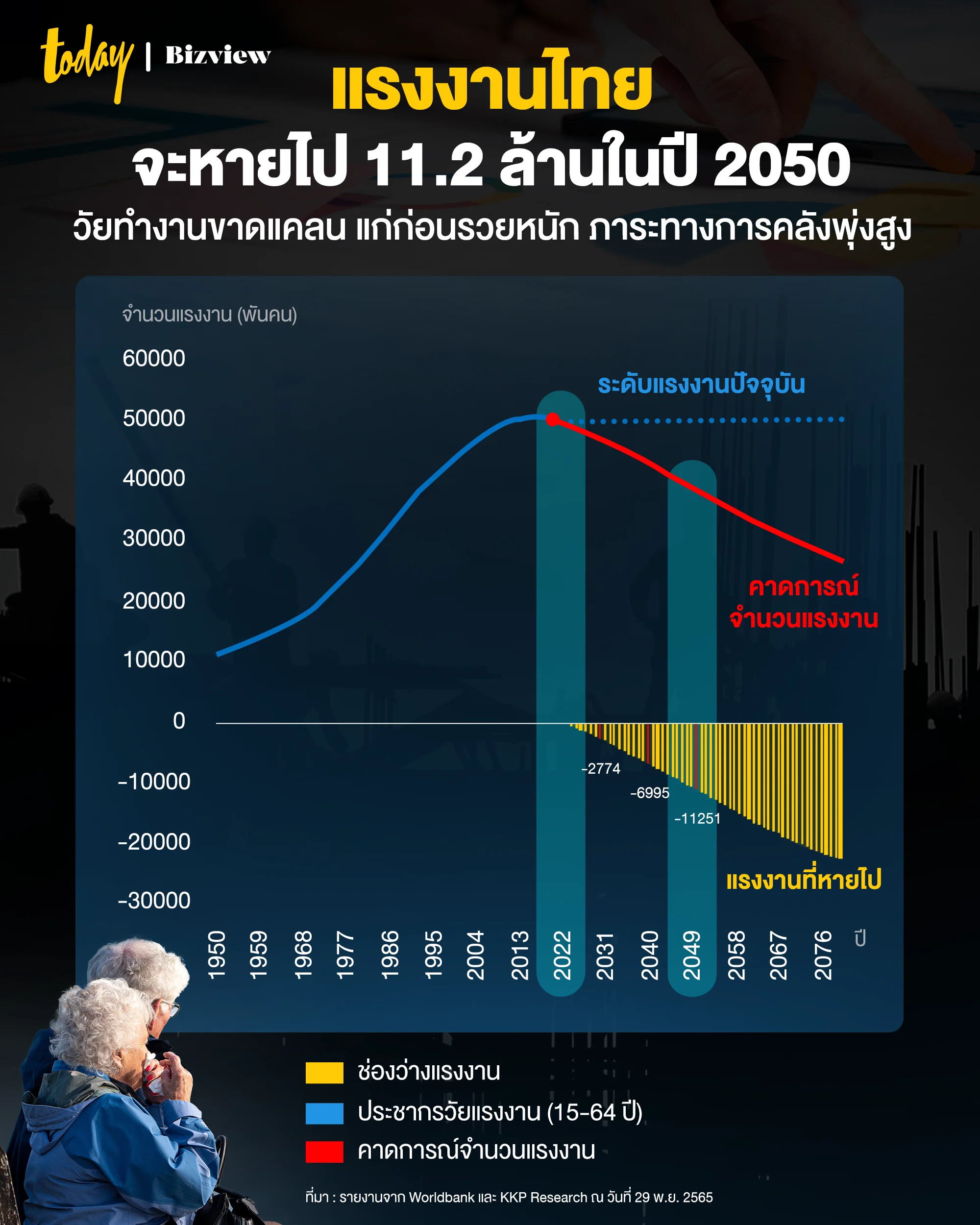 นอกจากนั้น ถ้าดูจากสถิติในรายงานจะเห็นว่า คาดการณ์ประชากรวัยทำงานไทย (15-64 ปี) จะลดลงมากในอนาคต โดยในปี 2050 จะลดลงกว่า 11.2 ล้านคนและลดลงเรื่อยๆ หลังจากนั้น